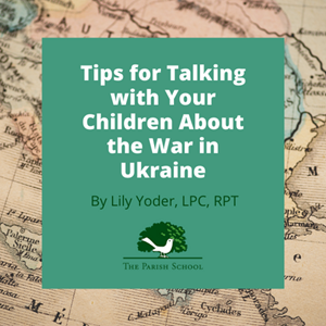 Urge compassion towards those affect by war. Once children are assured they are safe, many want to help and it’s important to help them do so. This supports building of empathy and provides a way of coping by taking action. Encourage younger children to help by simply drawing pictures, writing notes of kindness, or wishing well to the people of Ukraine. Wishing well is a concept from the Conscious Discipline social emotional curriculum that we use at Parish as way for students to support each other and calm themselves by offering love and caring to others. It provides a way to help others when there is no tangible way to offer help. To wish well 1) put your hands over your heart 2) take a deep breath in 3) pause and picture something precious in your mind 4) breathe out while opening your arms and sending those precious, loving thoughts out to the person you are wishing well. Elementary children can also wish well in addition to raising funds for reputable, sending letters to local decision makers, or helping to collect necessary items such as food, water, supplies to send to organizations supporting Ukraine efforts.